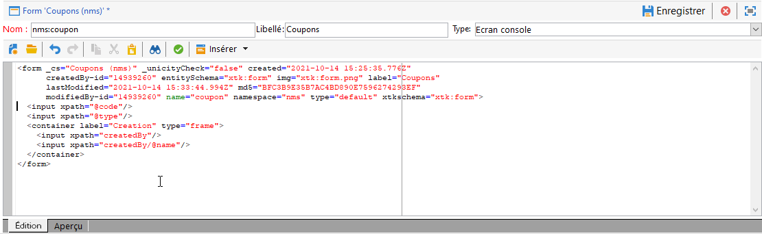 Pour concevoir des formulaires, modifiez le contenu XML dans l’éditeur XML :