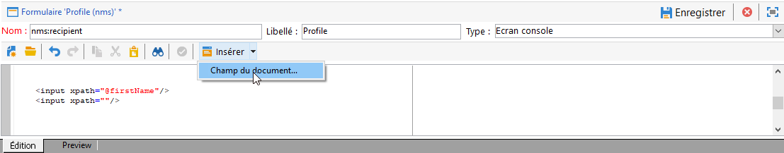 Par exemple, pour insérer un champ de saisie, utilisez l’élément <input>. Définissez l’attribut xpath sur la référence du champ en tant qu’expression XPath. En savoir plus.