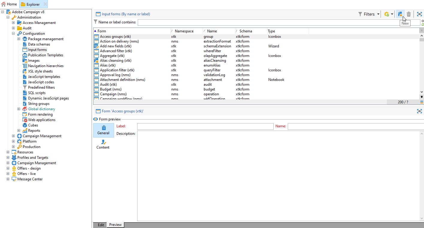Forms은 의 엔티티입니다 xtk:form 유형. 에서 입력 양식 구조를 볼 수 있습니다 xtk:form 스키마. 이 스키마를 보려면 Administration > Configuration > Data schemas 메뉴 아래의 제품에서 사용할 수 있습니다. 자세한 내용 양식 구조.