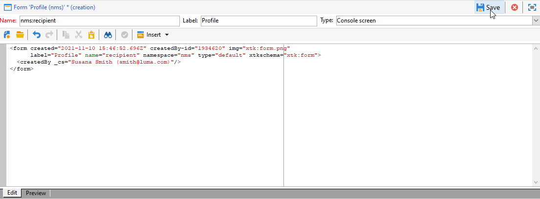 <form _cs="Profile (nms)" entitySchema="xtk:form" img="xtk:form.png" label="Profile" name="profile" namespace="nms" xtkschema="xtk:form">