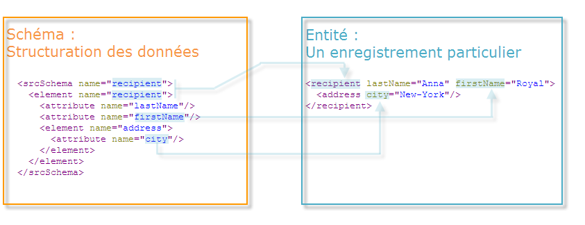 Les balises <element> définissent les noms des éléments d'entité. Les balises <attribute> du schéma définissent les noms des attributs dans les balises <element> auxquelles elles ont été liées.