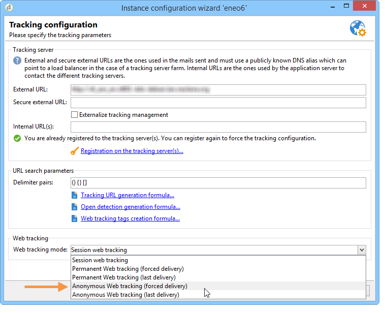 다음 익명 웹 추적 배포 마법사의 추적 구성 화면에서 모드를 선택해야 합니다.