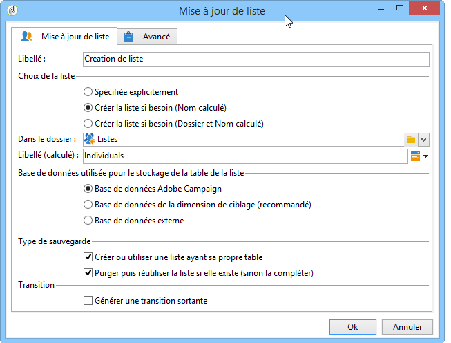 Double cliquez sur l'activité Mise à jour de la liste puis sélectionnez le bouton radio Créer la liste si besoin (Nom calculé).