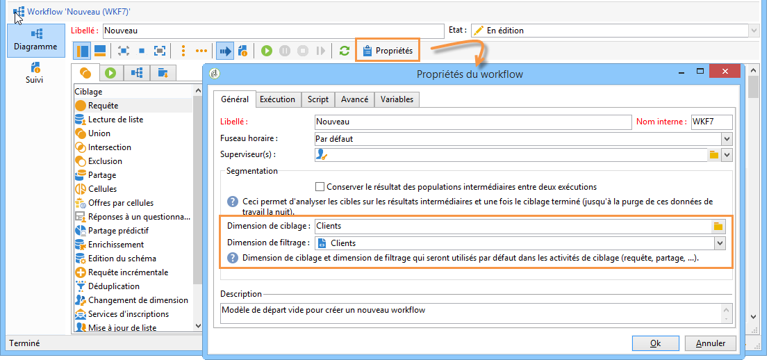 En basant vos nouveaux workflows sur le modèle nouvellement créé, votre table personnalisée sera sélectionnée par défaut au niveau des dimensions de ciblage et de filtrage globales du workflow.