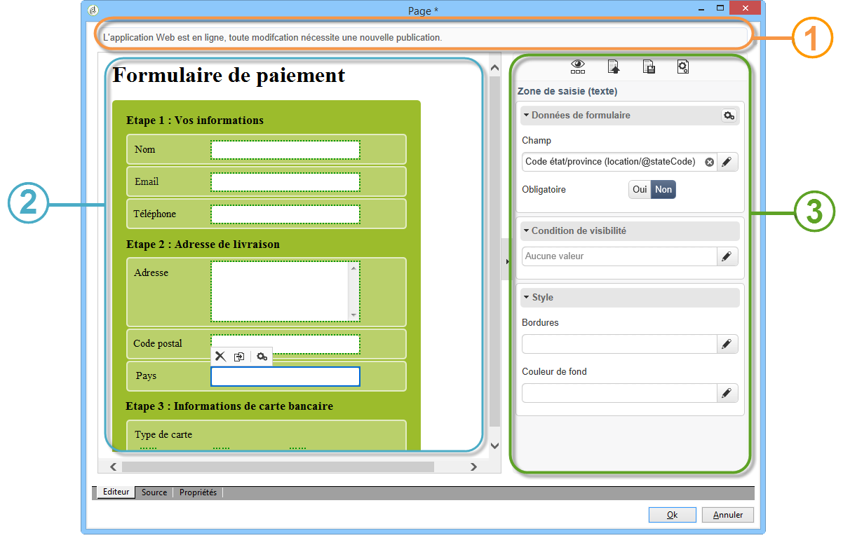 La section supérieure est une zone d'affichage pour des messages destinés à l'utilisateur. Ces messages indiquent le statut de l'application Web ou de la diffusion en cours de création ainsi que les avertissements et messages d'erreurs liés au contenu. Pour plus d'informations, consultez la section États du contenu HTML.