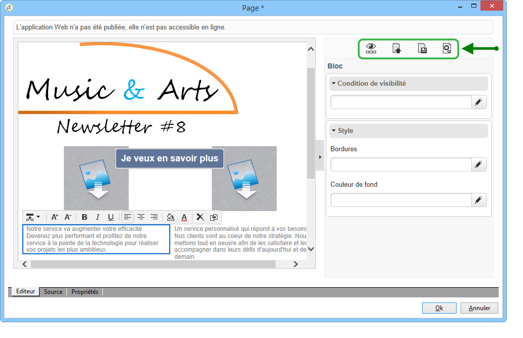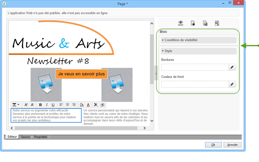 La section droite de la fenêtre est la zone de contrôle du rendu. Elle regroupe les différentes options de l'éditeur, notamment celles liées aux paramètres de l'entête de la page et aux options générales associées à un bloc : ajouter une bordure, associer un champ de la base à une zone de saisie, accéder aux propriétés de la page Web, etc. Voir à ce propos les sections Options globales et Editer le contenu.