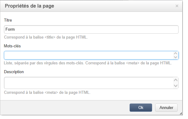 L'icône Propriétés de la page permet de saisir les informations contenues dans l'entête de la page HTML.