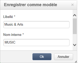L’icône Enregistrer comme modèle permet d’enregistrer le contenu actuel en tant que modèle. Vous devez saisir le libellé et le nom interne du modèle. Les modèles sont stockés dans le nœud : Ressources > Modèles > Modèles de contenu.