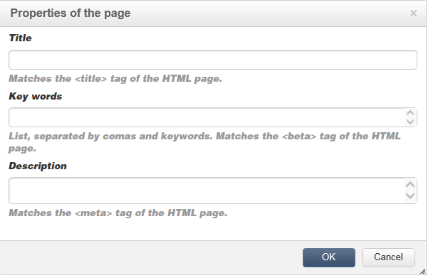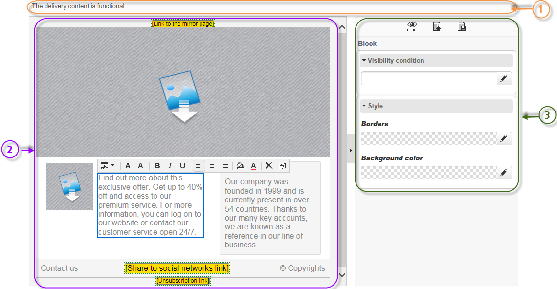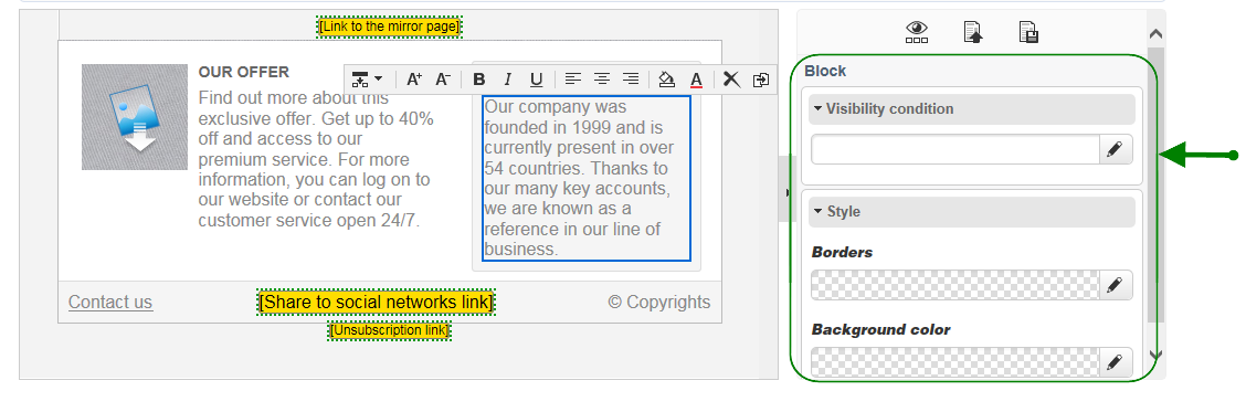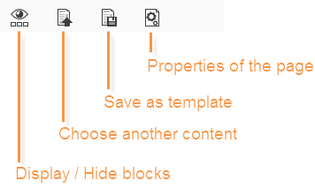 - 창의 오른쪽 섹션은 컨트롤 패널 영역입니다. 이 영역에는 편집기에 대한 다양한 옵션, 특히 블록 페이지 머리글과 일반 옵션 구성과 관련된 옵션(테두리 추가, 데이터베이스 필드를 입력 영역에 연결, 웹 페이지 속성에 액세스 등)이 그룹화됩니다. 자세한 내용은 전역 옵션 및 콘텐츠 편집 섹션을 참조하십시오.