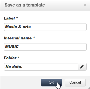 템플릿으로 저장 아이콘을 사용하면 현재 콘텐츠를 템플릿으로 저장할 수 있습니다. 템플릿의 레이블과 내부 이름을 입력해야 합니다. 템플릿이 Resources > Templates > Content templates 노드에 저장됩니다.