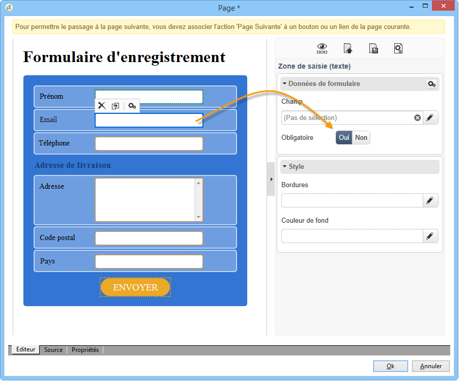Il est possible de rendre un champ obligatoire : par exemple, cliquez sur le champ Email puis activez l'option Obligatoire.