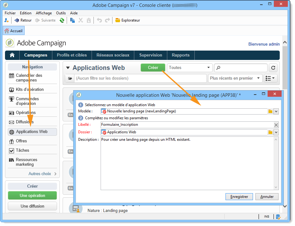 Dans l’onglet Campagnes, cliquez sur le lien Application Web, puis sur le bouton Créer.