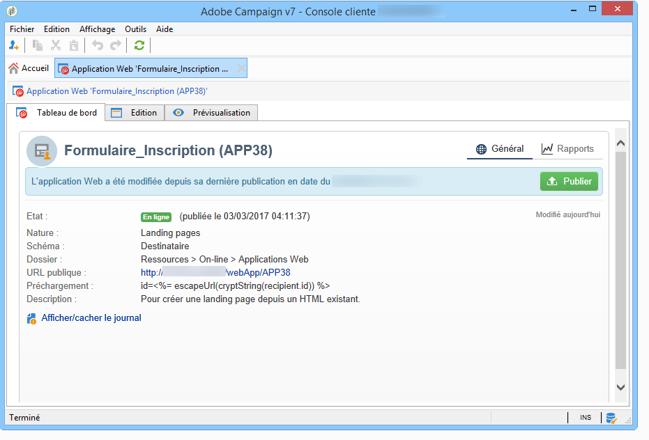 Lors de la publication, un journal est affiché. Le système de mise en ligne analyse l'intégralité des contenus présents dans l'application Web.