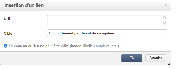 Saisissez l'adresse du lien visé dans le champ URL. Le champ URL est à renseigner de cette manière : https://www.monURL.com.