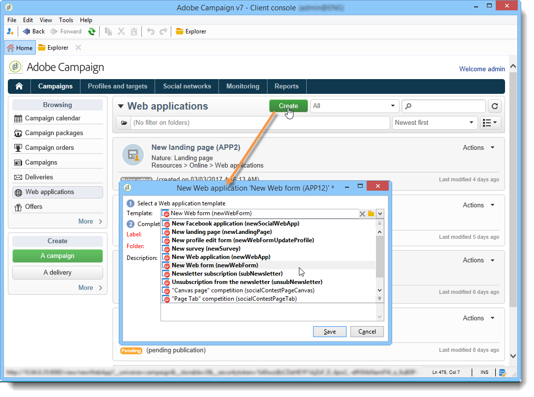 캠페인 탭으로 이동하여 Web Applications 메뉴를 선택하십시오. Create 버튼을 클릭합니다. 사용할 웹 응용 프로그램 템플릿을 선택합니다.
