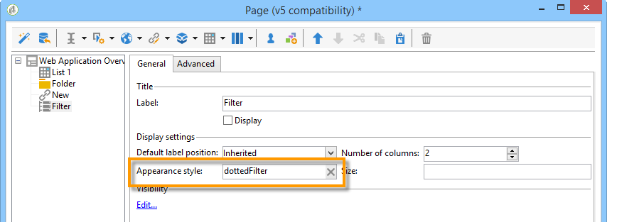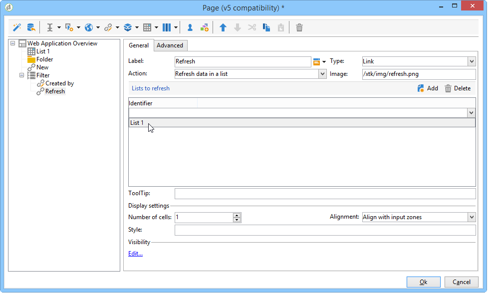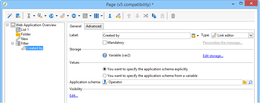 In this section, you will create a filter for displaying the overview of Web applications created by a specific operator. This filter is created with a link editor. Once you have selected an operator, refresh the list to apply your filter; this requires creating a refresh link.