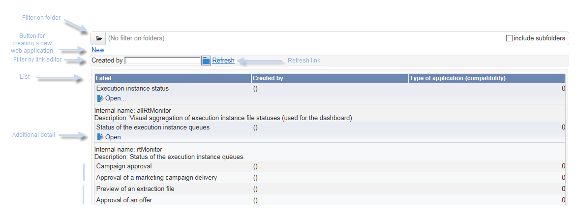 The list of Web applications available in your database is displayed.