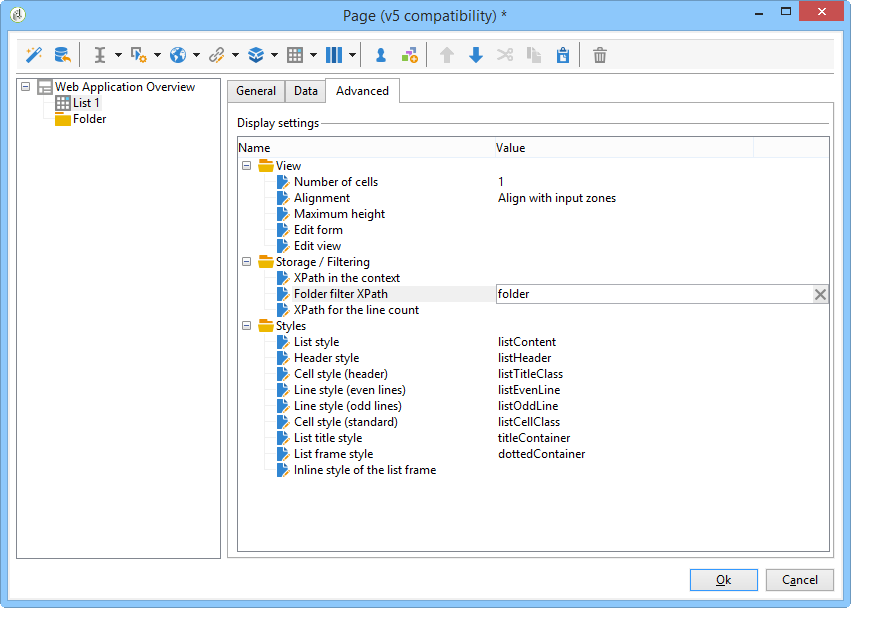 Place your cursor on your list, and in the Advanced tab, reference the variable previously created in the Folder filter XPath tab of the list. You must use the name of the element concerned by the folder link, i.e. folder.
