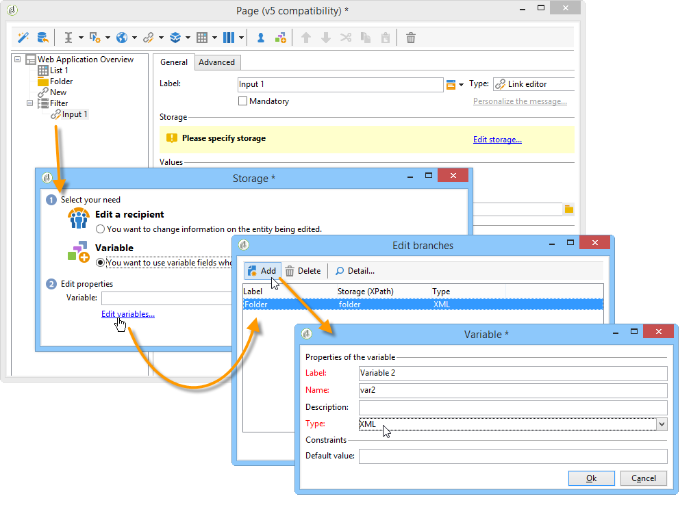 In the storage window which opens automatically, select the Variables option, then click the Edit variables link and create an XML variable for filtering data.