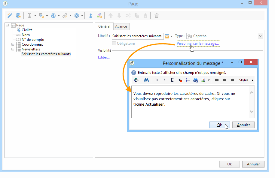 Vous pouvez créer un message d’erreur à afficher. Pour cela, utilisez le lien Personnaliser le message dans l’onglet Général.