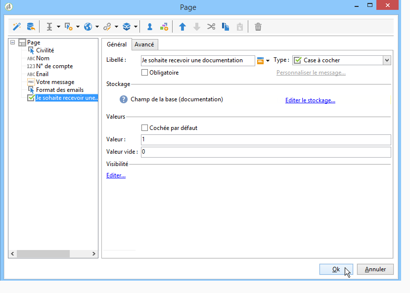 Une case à cocher permet d'attribuer au champ (ou à la variable) de stockage une valeur ou une autre selon que la case est cochée ou non. La section Valeurs permet de saisir la valeur à attribuer si la case est cochée (dans le champ Valeur) et la valeur à attribuer si la case est décochée (dans le champ Valeur vide). Ces valeurs dépendent du format de stockage des données.