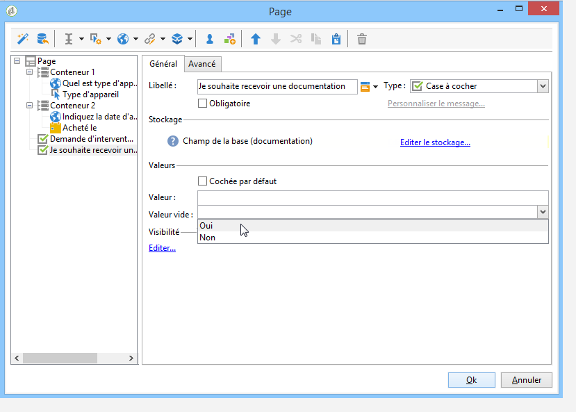 Si le champ (ou la variable) de stockage est de type booléen, la valeur à attribuer si la case n’est pas cochée est déduite automatiquement. Dans ce cas, seul le champ Valeur si coché est proposé, comme illustré ci-dessous :