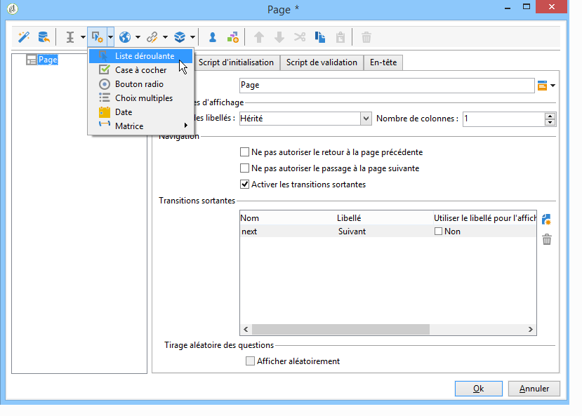 Pour ajouter une liste déroulante dans une page de formulaire, cliquez sur le bouton Contrôles de sélection > Liste déroulante… dans la barre d'outils de l'éditeur de page.