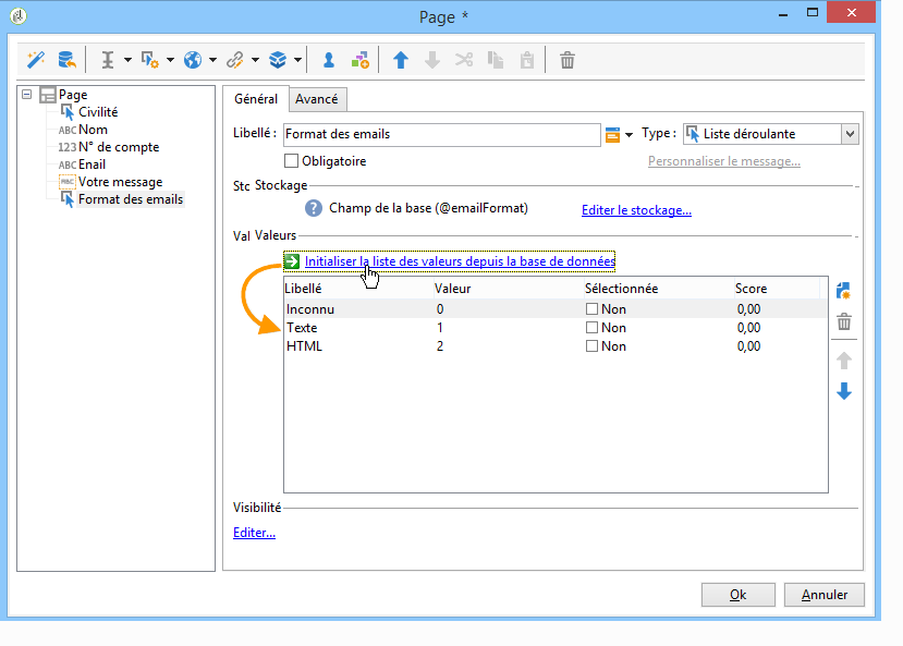- Sélection d'une liste déroulante. Voir Ajouter des listes déroulantes.