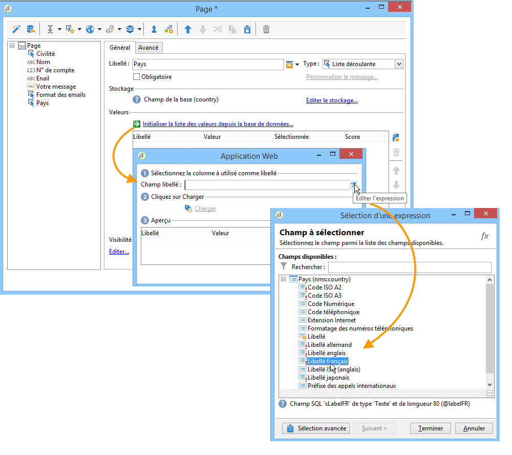 Si les données sont stockées dans une table liée, vous pouvez sélectionner le champ où sont enregistrées les valeurs à proposer dans la liste. Par exemple, si vous sélectionnez le tableau des pays, cliquez sur Initialiser la liste des valeurs depuis la base de données et sélectionnez le champ souhaité.