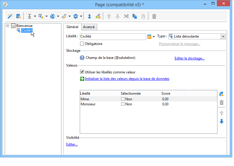 Vous pouvez modifier le mode de stockage des réponses à partir du lien Editer le stockage…. Les valeurs peuvent être enregistrées dans un champ existant de la base de données, mais vous pouvez choisir de ne pas enregistrer les informations dans la base, en utilisant une variable locale.
