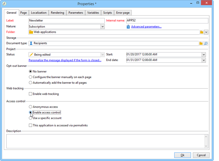 예를 들어 인트라넷 사이트에서 양식을 전달할 때 사용자를 인증하기 위해 양식 표시에 대한 액세스 제어를 활성화할 수 있습니다. 이렇게 하려면 관련 양식의 Properties 창을 표시하고 아래와 같이 Enable access control 옵션을 클릭합니다.