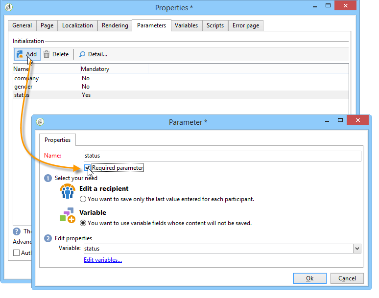 폼의 속성 창에서 Parameters… 탭을 통해 매개 변수를 추가할 수 있습니다. 아래와 같이 필수로 지정할 수 있습니다.
