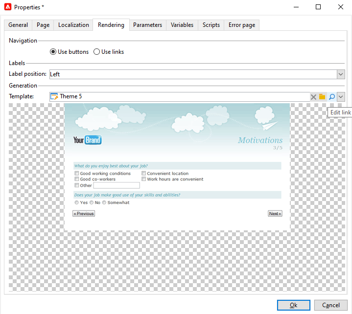 Rendering 탭에서는 웹 폼의 페이지와 사용된 렌더링 템플릿 사이의 탐색 유형을 정의할 수 있습니다.