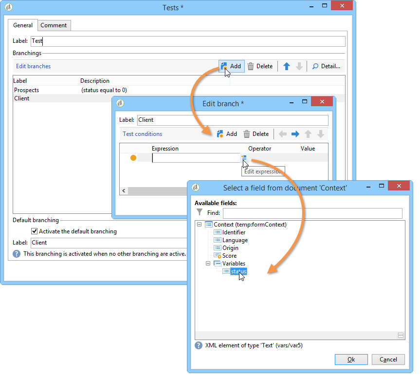 응답자 상태(0, 1 또는 기타 값)를 양식에 액세스하기 위해 URL에 추가할 수 있습니다. 이 정보는 폼의 페이지나 테스트 상자에서 다시 사용할 수 있습니다. 표시되는 페이지는 아래와 같이 컨텍스트의 값을 기준으로 조건을 지정할 수 있습니다.