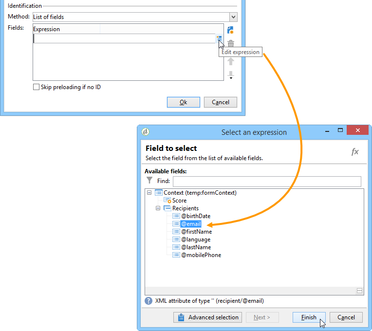 이 옵션을 사용하면 양식의 현재 컨텍스트에서 필드, 데이터베이스에서 해당 프로필을 찾는 데 사용할 필드 중에서 선택할 수 있습니다.