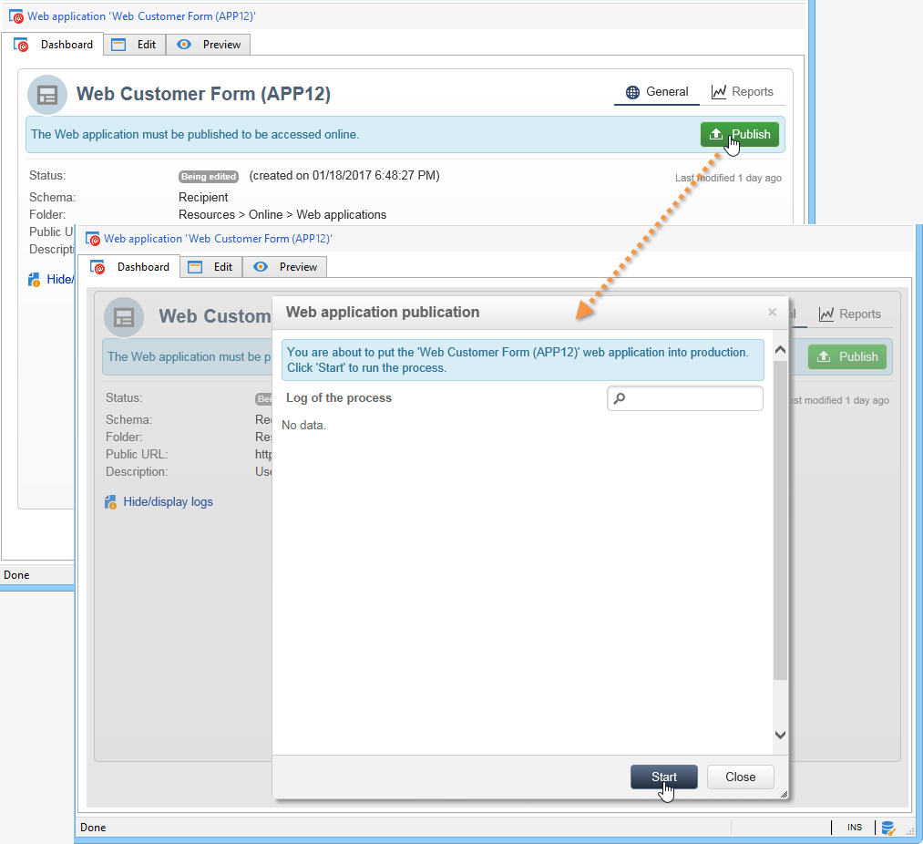 양식의 상태를 변경하려면 양식을 게시해야 합니다. 이렇게 하려면 Publication 단추를 클릭합니다.