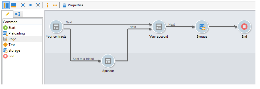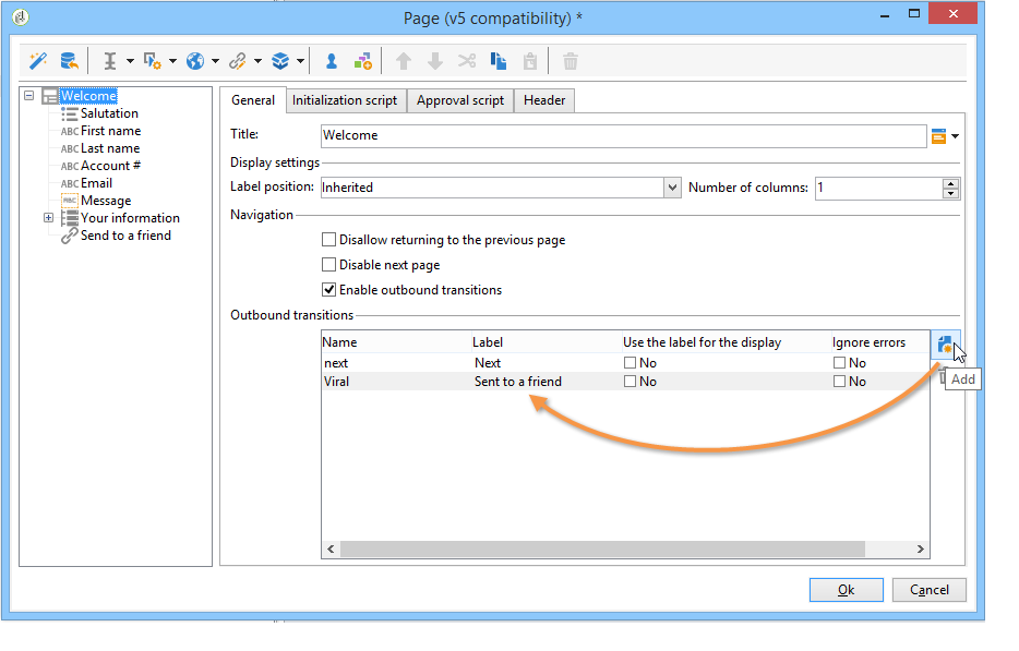 기본적으로 페이지에는 출력 전환이 하나만 있습니다. 새 전환을 만들려면 페이지를 선택한 다음 아래와 같이 Output transitions 섹션에서 Add 단추를 클릭합니다.
