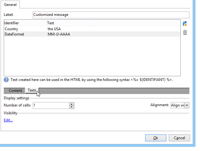Text 탭에서는 다음 구문을 사용하여 <%= 및 %> 문자 사이의 HTML에서 사용할 수 있는 변수 필드를 만들 수 있습니다. $(IDENTIFIER).