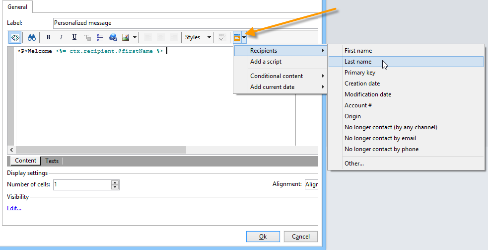데이터베이스 필드를 삽입하려면 개인화 버튼을 사용합니다.