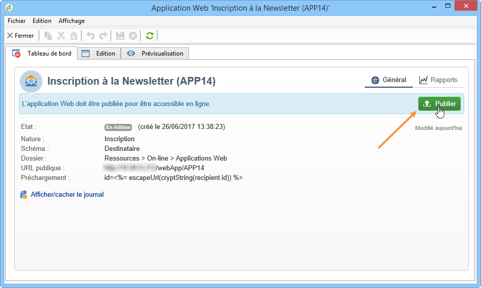 A l’aide du DCE, associez l’URL au formulaire web. Comme le formulaire web n’est pas encore créé, remplacez la valeur dès sa création.