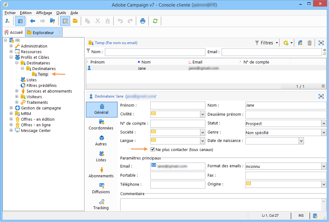 À cette étape, l'utilisateur est ajouté dans la base de données Adobe Campaign, dans le dossier Temp, et son profil est placé sur la liste bloquée jusqu'à ce qu'il valide son inscription à l'aide de l'email.