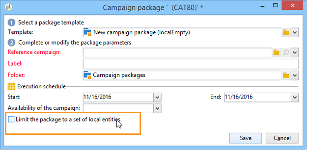 로컬 캠페인의 경우 중앙 엔티티는 를 확인하여 관련 로컬 엔티티를 지정할 수 있습니다 Limit the package to a set of local entities.