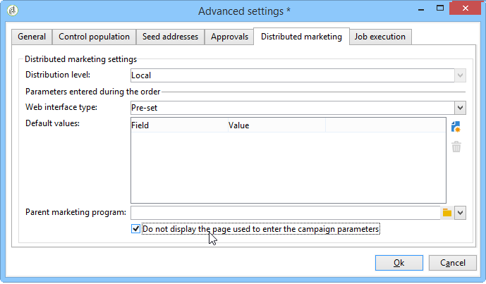 다음 Advanced parameters for campaign entry 을(를) 확인하여 비활성화할 수 있습니다. Do not display the page used to enter the campaign parameters.