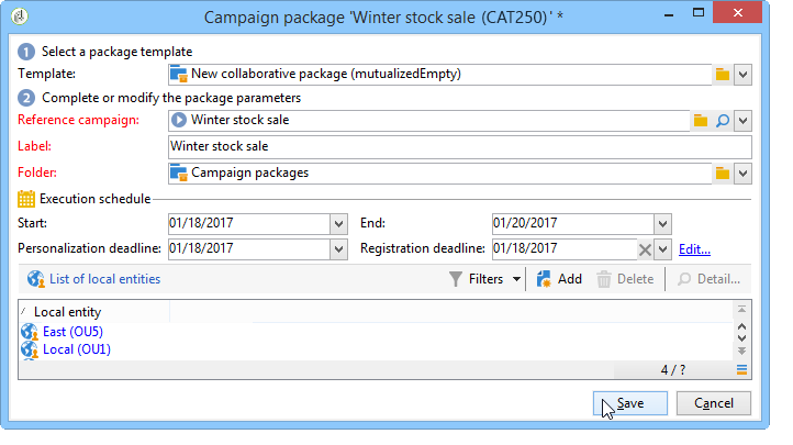 실행 일정 및 관련 로컬 엔티티를 지정하여 캠페인 패키지를 만듭니다.