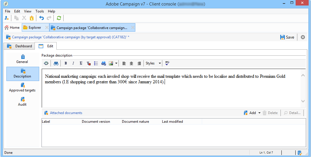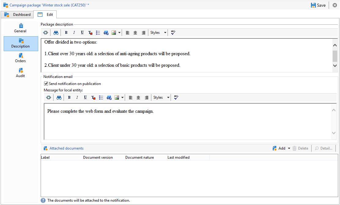 에서 Description 탭에서 캠페인 패키지 설명, 패키지를 게시할 때 로컬 엔티티에 보낼 알림 메시지를 입력하고 모든 유용한 문서를 캠페인 패키지에 첨부할 수 있습니다.