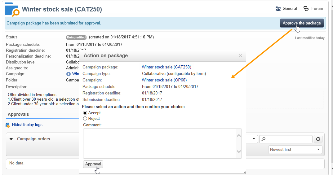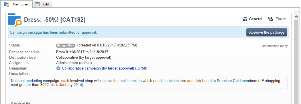선택 Reference campaign. 에서 Edit 패키지의 탭에서 Approval mode 캠페인에 를 사용하려면: