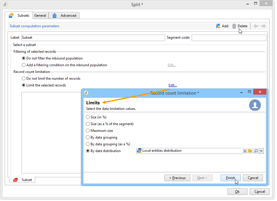 에서 Targeting and workflows 탭에서 캠페인에 대한 워크플로우를 만듭니다. 여기에는 다음이 포함되어야 합니다 분할 활동 Record count limitation 는 Data distribution 활동.