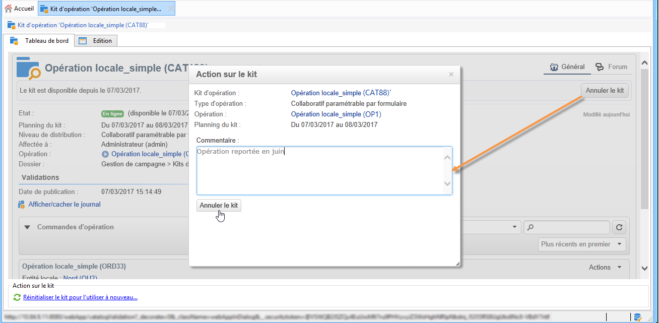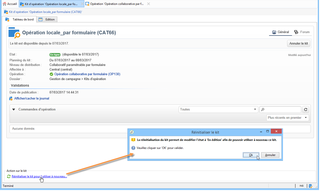 Une fois annulée, l'entité centrale peut toujours accéder au kit et éventuellement le réinitialiser, au besoin. Il ne sera à nouveau proposée aux entités locales que lorsqu'il sera validé et démarré. Le processus de réinitialisation d'un kit d'opération est présenté ci-après.