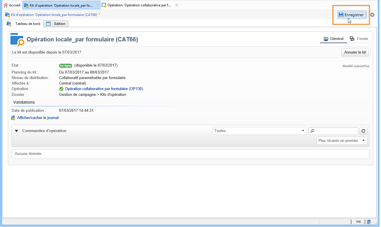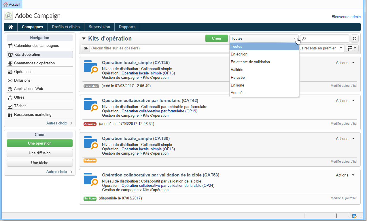 Le kit prend le statut En édition. Il peut alors être modifié puis validé et publié pour être à nouveau proposé dans la liste des kits d'opération.