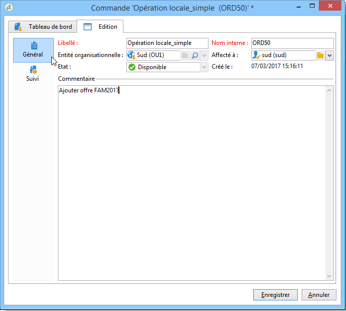 L'onglet Edition > Général permet de consulter les informations renseignées par l'entité locale lors de la commande de l'opération.